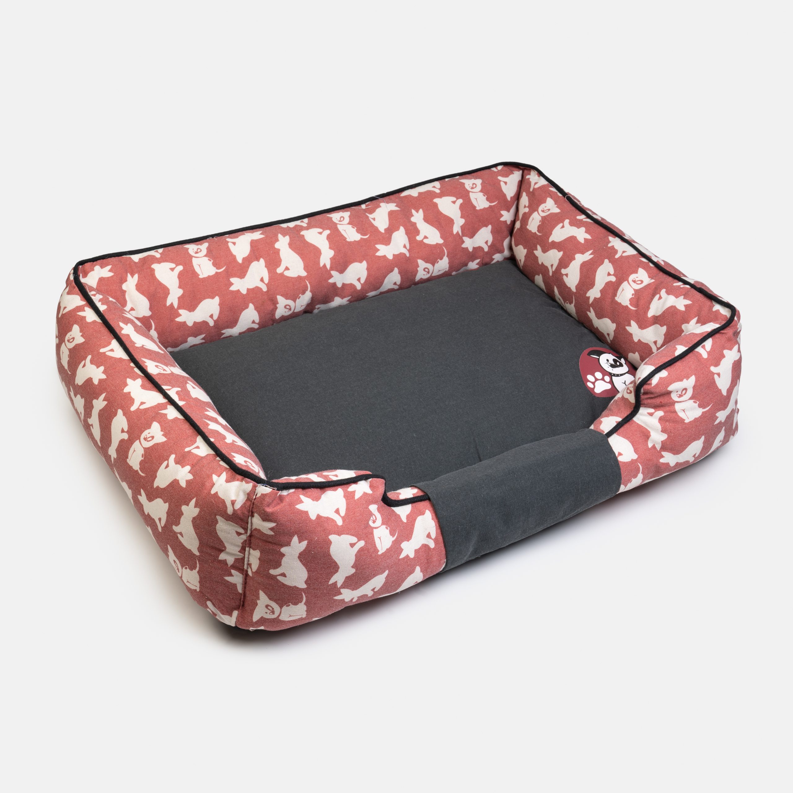 Haz que tu peludo disfrute del mejor descanso con esta cama acolchonada de diseño encantador. Con un estampado de perritos en tonos rojizos y un cojín central en gris oscuro, esta cama es perfecta para darle a tu mascota un espacio cómodo y acogedor.